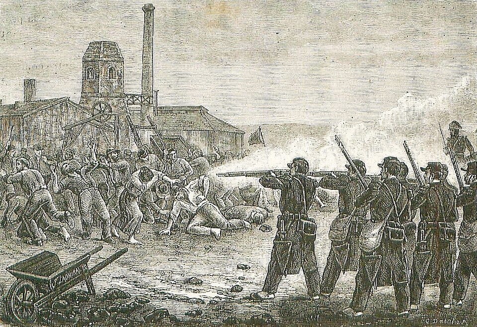 By the late 1860s, using strikes as a weapon had spread across France. In La Ricamarie, a mining town near Saint-Étienne, workers walked out in June 1869 to protest wage cuts. Their families joined them in a peaceful march, women and children walking at the front of the group. Suddenly, troops opened fire into the unarmed crowd. Fourteen people were killed, including several children. Newspapers across France carried the story, and the massacre became a rallying cry for the young labor movement.